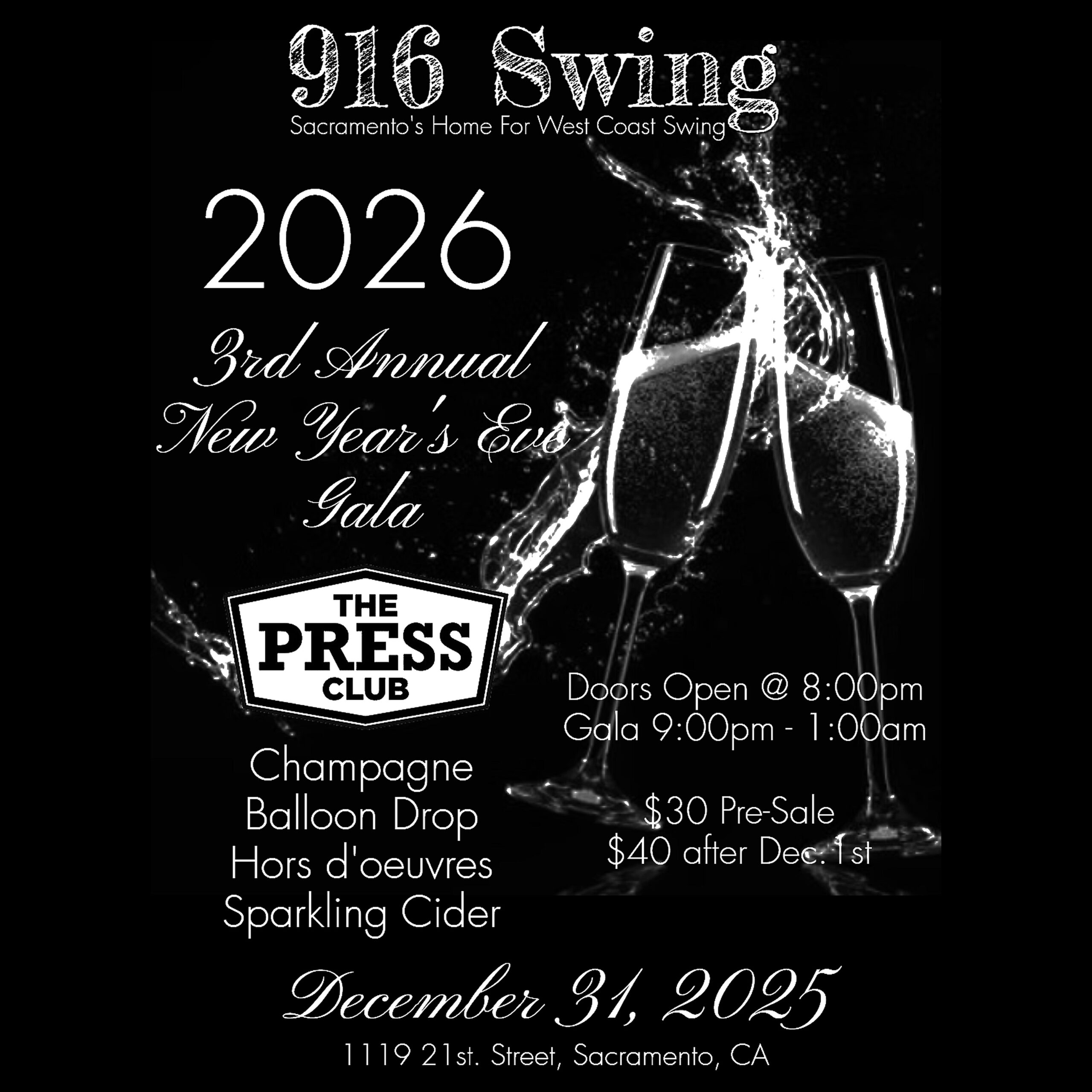 The Press Club 1119 21st Street, Sacramento, CA, United States916 Swing, Sacramento's home for West Coast Swing dancing, is hosting their third annual New Year's Eve Gala. This event will feature champagne/sparking cider, a balloon drop, and hors d'oeurves....